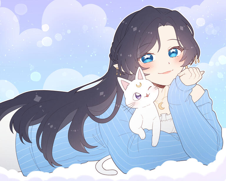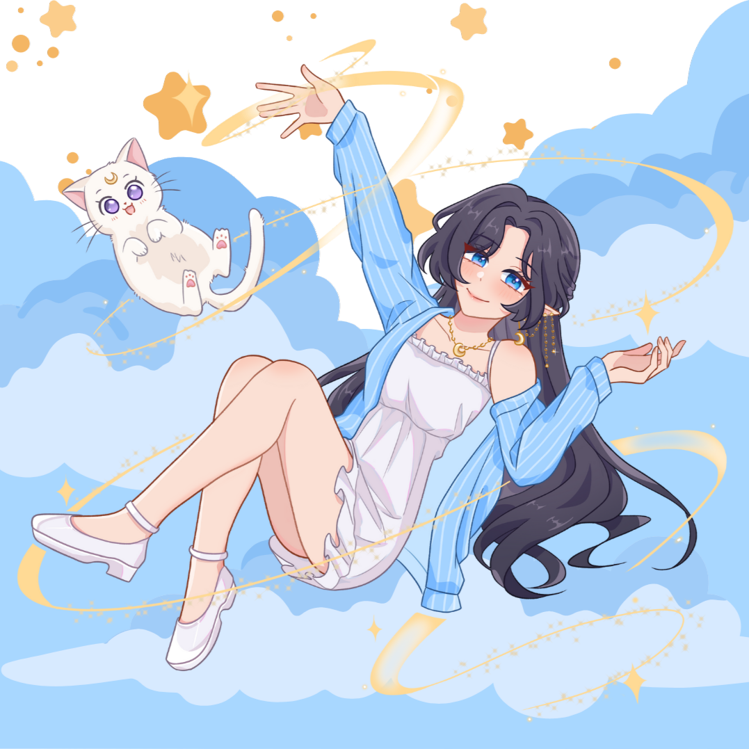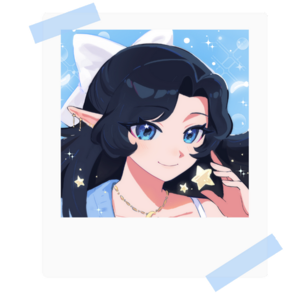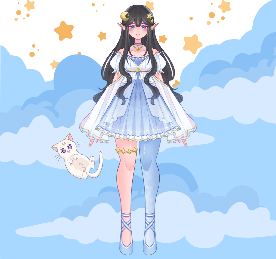 Long ago, before time held meaning and before dreams had names, Amatsu was born among the stars — a celestial elf formed from stardust, where constellations were woven into existence. She was not created for just one world, but destined to wander across countless galaxies. With hair as dark as the night sky and eyes that shimmer like distant stars, Amatsu drifts from one world to the next. Wherever light begins to fade and hope flickers in the void, she follows.Her purpose is simple: to guide lost souls through the darkness and help those who have forgotten how to dream. Amatsu shines as a beacon in the shadows. Some call her a guardian, others a myth — but to her, she is simply a starborn traveler, here to carry the light, spread laughter, and remind the cosmos that even in the vast silence of space, there will always be a glimmer of hope. With her companion Artemis by her side, she continues along her journey — ever wandering and ever dreaming!Then Amatsu discovered the internet, unlocking a whole new world where she could connect with new souls, spreading her light and sharing joy.